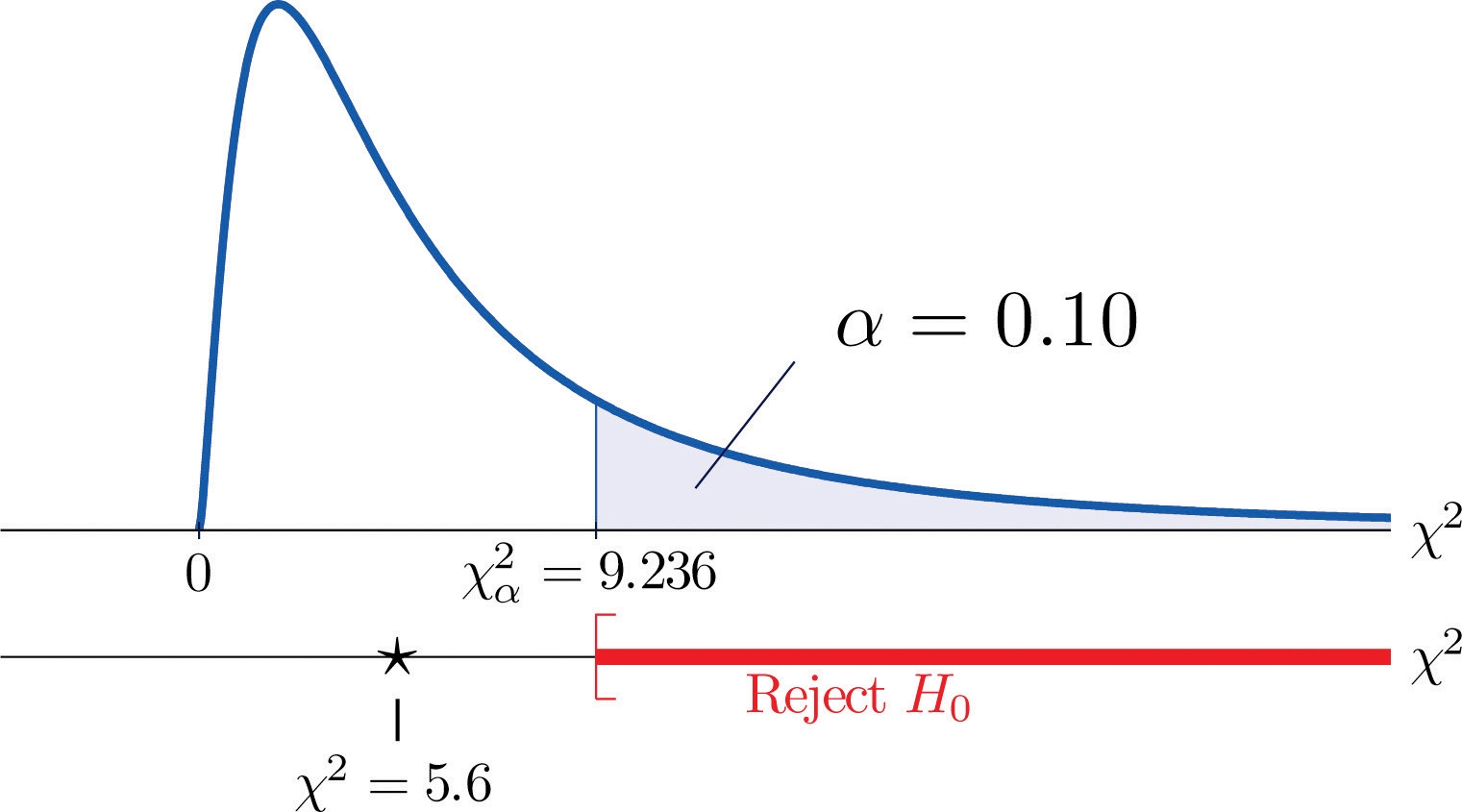 If we had decided at the outset to test at the 10% level of significance, the critical value defining the rejection region would be, reading from Figure 12.4 "Critical Values of Chi-Square Distributions", χα2=χ0.102=9.2366 , so that the rejection region would be the interval [9.236,∞) .