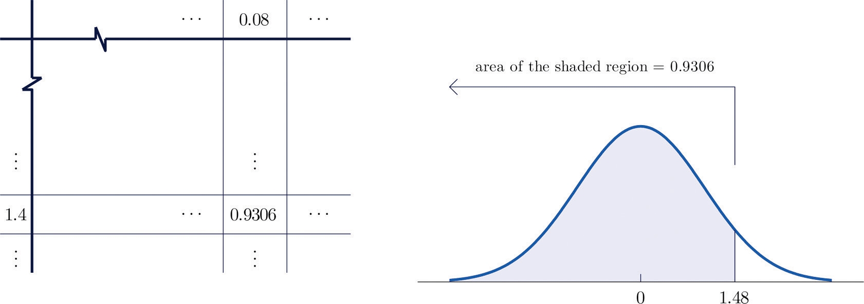 Figure 5.10 "Computing Probabilities Using the Cumulative Table" shows how this probability is read directly from the table without any computation required. The digits in the ones and tenths places of 1.48, namely 1.4, are used to select the appropriate row of the table; the hundredths part of 1.48, namely 0.08, is used to select the appropriate column of the table. The four decimal place number in the interior of the table that lies in the intersection of the row and column selected, 0.9306, is the probability sought: P(Z<1.48)=0.9306.