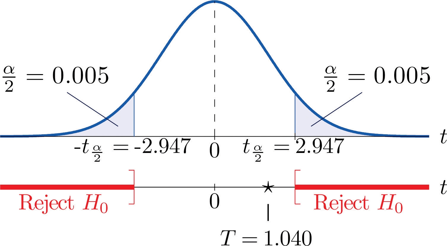 Step 4. Since the symbol in Ha is “ = ” this is a two-tailed test, so there are two critical values, ±tα∕2=±t0.005. From the row in Figure 12.3 "Critical Values of " with the heading df=15 we read off t0.005=2.947. The rejection region is (−∞,−2.947]∪[2.947,∞).
