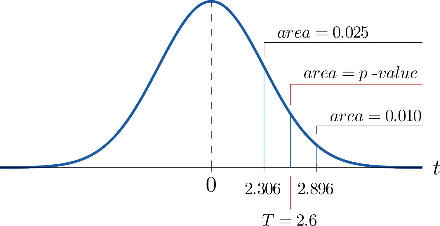 The area cut off by tc=2.306 is 0.025 and the area cut off by tc=2.896 is 0.010. Since 2.600 is between 2.306 and 2.896 the area it cuts off is between 0.025 and 0.010. Thus the p-value is between 0.025 and 0.010. In particular it is less than 0.025. See Figure 9.6.