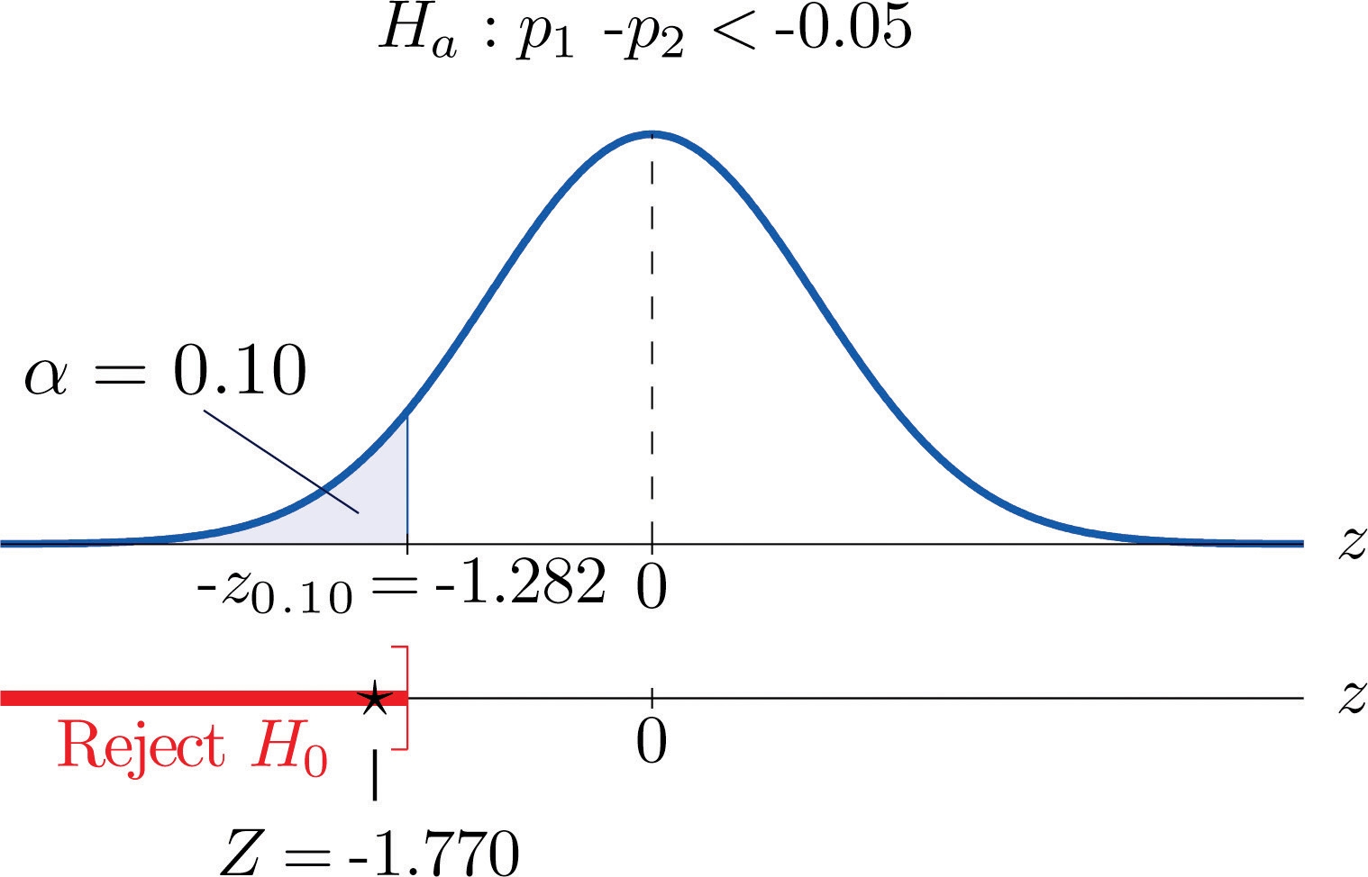 Step 4. Since the symbol in Haβ is β < β this is a left-tailed test, so there is a single critical value, zΞ±β=βz0.10β. From the last row in Figure 12.3 "Critical Values of " z0.10β=1.282 , so βz0.10β=β1.282. The rejection region is (ββ,β1.282β].