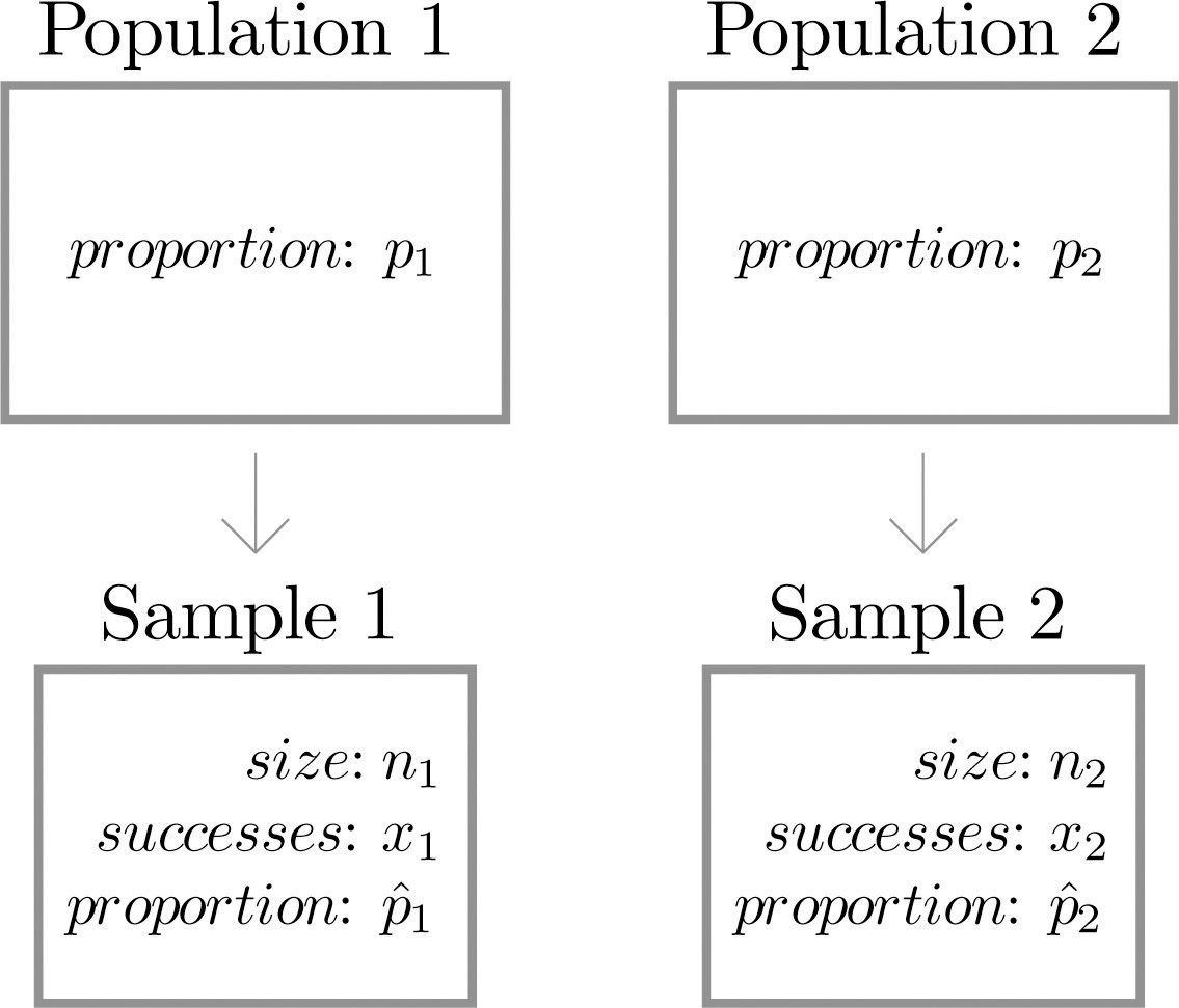 Figure 9.7 "Independent Sampling from Two Populations In Order to Compare Proportions" illustrates the conceptual framework of our investigation. Each population is divided into two groups, the group of elements that have the characteristic of interest (for example, being left-handed) and the group of elements that do not. We arbitrarily label one population as Population 1 and the other as Population 2, and subscript the proportion of each population that possesses the characteristic with the number 1 or 2 to tell them apart.